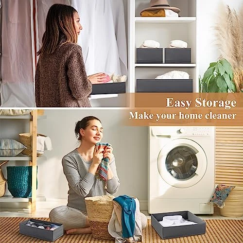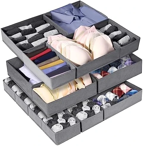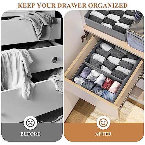 - 【STURDY and DURABLE】Made of non-irritating and odorless non-woven material with delicate stitching, the drawer organizer for clothing is durable enough for repeated and long-term use. Four high-density 1.8mm cardboards are inserted into the sidewalls, which are durable, not easy to bend or break. The breathable construction ensures air circulation and keep clothes a good smelling.