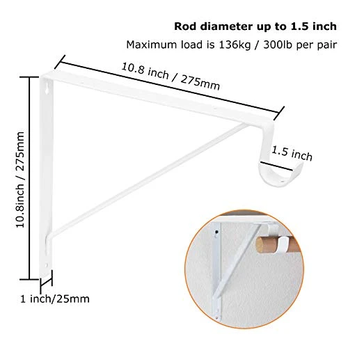 - 【300lbs Holding Capacity Per Brackets Pair】Closet hanging rob brackets hold large shelves above the rod to allow multi-purpose heavy-duty storage, adding extra storage space of wall; Holds up to 300 lbs per bracket pair when properly installed in to studs