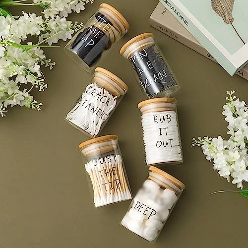 - work for different items: our glass apothecary jars with lids have reasonable size, can be applied for many items, such as cotton swabs, cotton balls, dental floss, hair clips, hair ties, tampon, beauty egg, makeup brush, face brush, hair bands, clips, candies, etc., make your bathroom more neat and beautiful