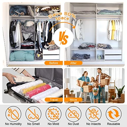 - 【Increase usage space】: Increase your storage space without cleaning out the closet! Our space saving bags are the ideal solution to add more storage space to your wardrobe, attic and suitcase. They’ll come in handy when you’re moving, or changing seasonal items in your closet, adding up to 80% more storage space.
