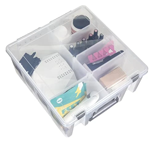 - Product Details: the Double Deep measures 15.25 x 14 x 6.25 in. This clear box with silver accents is stackable with other Super Satchel products.