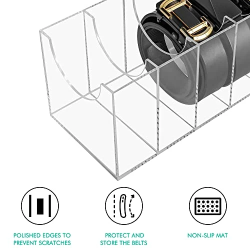 - Sturdy and Clear: The belt holder is made of sturdy and durable 4mm acrylic sheet .This tie organizer is sturdy, durable, waterproof,and the sleek case ensures that it won’t harm to your belts. Acrylic stronger than plastic. These clear compartments are easy to see and display your belts, make your belt to look advanced and neat in your room.