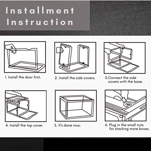 - ⬜ EASY INSTALLATION: Our shoe boxes are easy to install. It takes around 2 minutes to install each box and comes with instructions and everything you need to start getting organized. The transparent clear drop front lid is for optimal view.