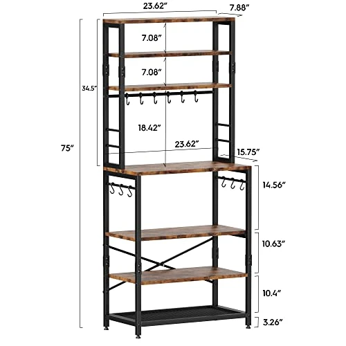 - 【Retro Style baker’s rack】:This baker’s rack is made of particleboard and iron bracket. The iron bracket is sturdy and durable, and the wooden board is waterproof and anti-friction. Also, its dimensions are 23.6 inches (length) x 15.7 inches (width) x 70.2 inches (height).