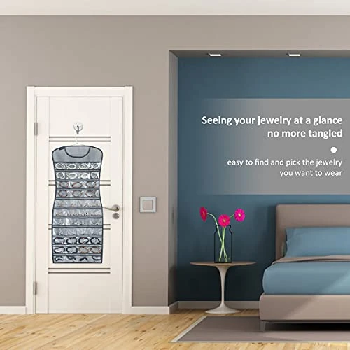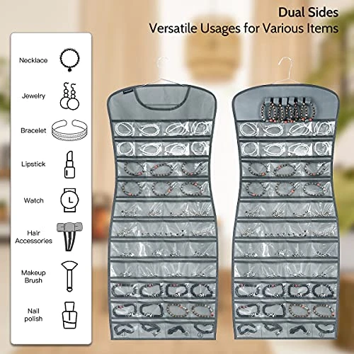 - Dual-sided jewelry holder with 84 transparent pockets to store bracelets, earrings and hair accessories. 6 Hook loops on the top are used for necklaces organization without tangle. Good visual on all items, easily see and pick your accessories even in dim wardrobe.