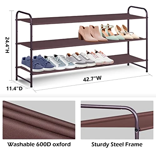 - 【Wider and Higher than others】: Each tier can holds up to 6 pairs of women’s shoes, or 5 pairs of men’s tennis shoes or 9 pairs of kid’s shoes; the height of each shelf is 8″, shoe organizer for closet fits heels and high boots well, oxford fabric shelf well prevent baby’s small shoes and high heels from sinking and dropping;