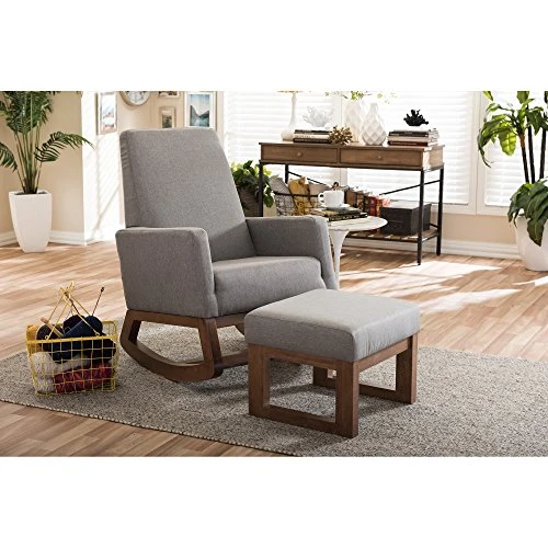 - Featuring polyester fabric in grey and a sturdy wood frame in a beautiful walnut finishing, this retro rocking chair feels right at home in a nursery, living room or any shared space