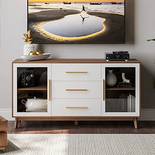 - [SPACIOUS STORAGE] Three pull-out drawers can hold cutlery, fine china, serveware, etc. This glass-door storage buffet has cabinets with adjustable shelves that also double up as display units to show off your heirlooms and favorite accessories.