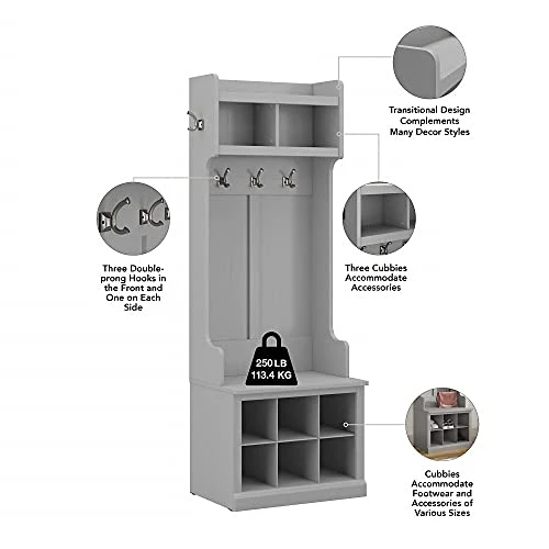 - Hall Tree includes three double-prong coat hooks in the front and one on each side for hanging jackets, hats, scarves and more