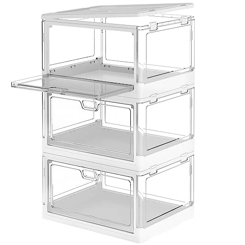 - 【Durable & Stackable】The plastic bins for storage with lids are made of premium sturdy and heavy-duty PP material, which is durable and solid. Sturdy enough to bear weight up to 100 lbs (45 kg). The groove design on the folding storage boxes allow them stack up without tipping. When they are not in use, the collapsible storage bins can be folded up and stay under the sofa, will not take up space.