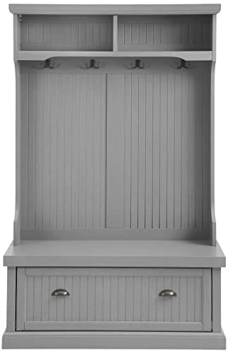 - Hinged drop-down cabinet door on the entryway storage bench has a magnetic closure