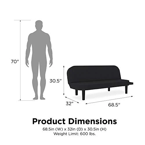 - Product dimensions: Sofa: 68.5”L x 32”W x 30.5”H. Sleeping: : 68.5”x 38.5”W x 16.5”H. Weight limit: 600 lbs. Net weight: 52.5 lbs. Shipping dimensions: 70”L x 40”W x 6”H. Gross weight: 62 lbs.