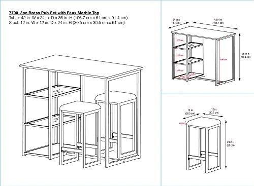 - Set features a faux marble top with a soft brass metal finish base and tempered glass shelves. Made with a strong and durable wood and metal construction. Stools have a straight leg stool design with a built-in footrest.