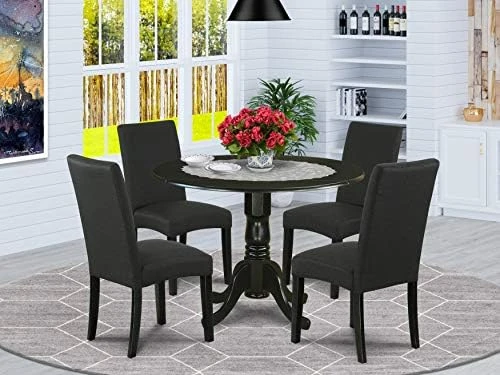 - The wood dinette set has a black solid wood kitchen table and frame and a gorgeous Black Linen Fabric kitchen dining chairs seat and back that give elegance to your dining room and enhance the charm of your excellent dining room.