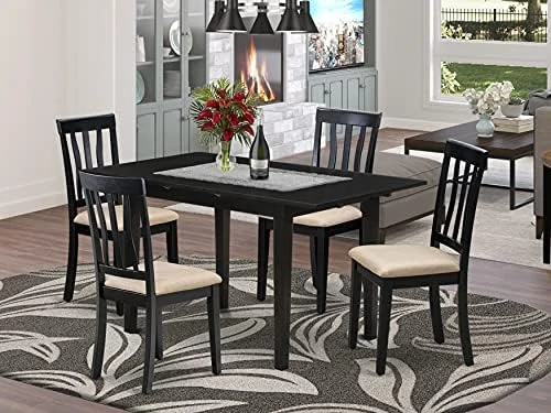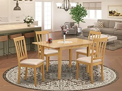 - A Modern dining table and 4 attractive dining chairs that boost the attractiveness of your dining area. This 5-Piece dining table set adds a modern with a distinctively glossy Appearance with a rectangular table top and Linen Fabric seat dining chairs.