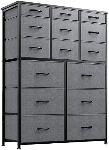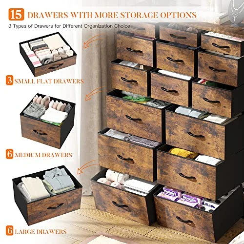 - One Tall Dresser for All Organization Needs. What else do you need if this brown dresser meets your organization needs and storage needs at the same time? This tall bedroom dresser comes with 15 drawers in 3 types, easily manage all items according to different sizes. Large drawers in fabric dresser are suitable for larger items like jackets, plush toys and books, medium drawers could bear 10 more folded shirts, small drawers are perfect for socks, and the wood top could bear lamps, TVs.