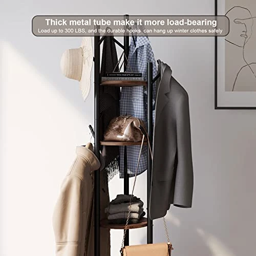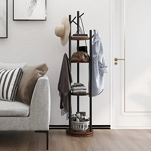 - [Space-Saving and More Storage] This compact coat stand takes little space while keeping the room tidy and orderly. 9 hooks easily meet your daily hanging needs,4 tier shelves for storage or display.The free standing coat rack tree fits perfectly into even a small hallway, narrow foyer or near to entrance for household essentials, also in the corner of bedroom, office or living room