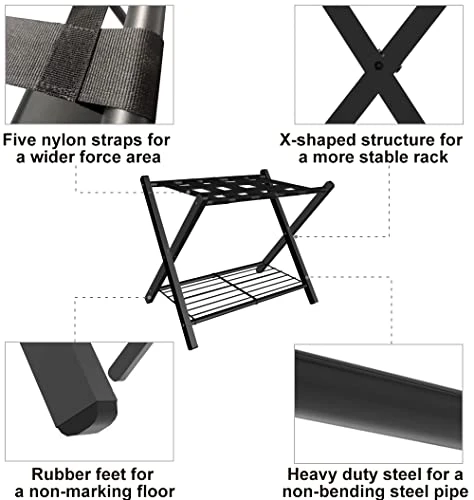 - HEAVY-DUTY CONSTRUCTION: Made of heavy-duty steel tubing with an X-shaped design, the five sturdy nylon straps make this luggage stacker stable and sturdy enough to hold up to 200 lbs. The rubber feet protect your floor from scratches.