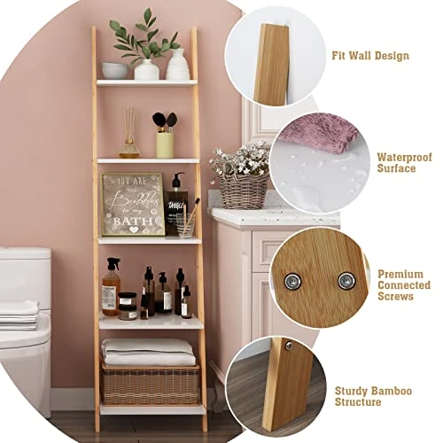 - QUALITY MATERIAL: This ladder shelf is crafted of quality particleboard and sturdy bamboo frame, and it is fixed with high quality non-rusty screws, without worrying about bending or deformation. The shelf surface is painted with environmental paint, smooth surface is no harm to human body.