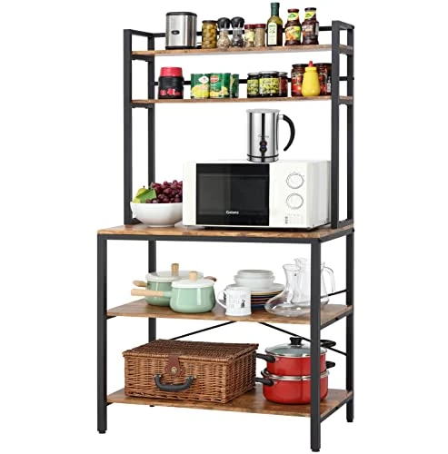 - NO MORE CLUTTERED & SPACE SAVING: Are you already sick of clutter on your countertops or rooms? With this rustic spacious utility rack, you can storage everything easily in an orderly way. The vertical structures take up little floor space but add super storage space for kitchenwares, snacks, books, decors, tools or other bits and pieces. You can use it as a Bakers Rack, Coffee Bar, Microwave Oven Stand, Display Stand, Printer Stand, Bookshelf, Pantry Shelves, Garage Storage Shelving etc. Perfect for storing nearly all your types or sizes stuff for Kitchen, Living Room, Home Office, Pantry, Garage. Everything in its place and bring you a tidy home.