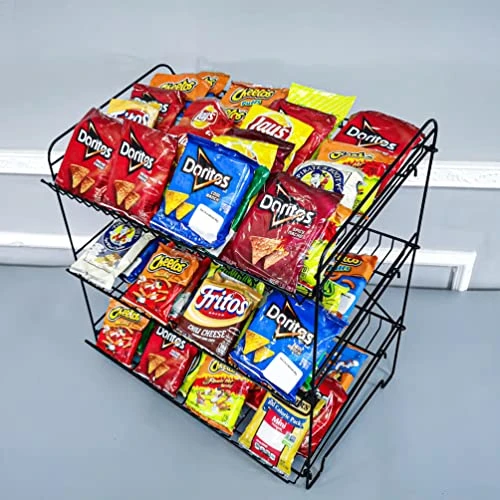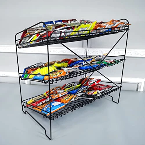 - 【Other chip organizer with clips】Consider strips with hook or countertop chips hangers: B07ST9TDVD ; B09JVQ35CQ ; 【3 Wide Open, Removable Shelves, Bonus zip ties】The wire rack features three wide open shelves with a 7.5″ clearance and a 1.25″ tall lip on the front and back. The shelves are removable, so you can choose to use fewer shelves if desired.