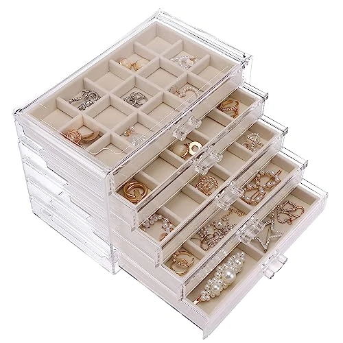 - Sturdy & Durable – The outside is 0.17″ thick tough acrylic, including the shell and drawers. Interior tray is made of soft velvet-like fabric-wrapped MDF. Elegant drawer handles are easy to grasp and pull, elegant and functional.