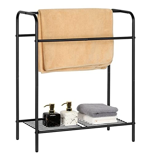 - 【Sturdy and Durable】The frame of the floor towel rack is made of high-quality metal, which ensures that the items can be placed stably and will not be wobble or topple over, ensuring the use for a long time. Premium matte black surface, very easy to clean.