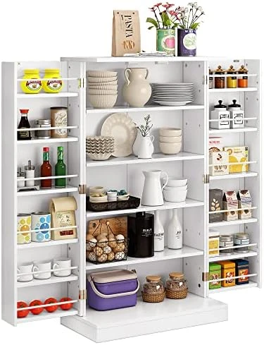 - User-friendly Design: The storage cabinet features 6 height-adjustable shelves that enable users to design a customized space for different-sized kitchen essentials, such as tableware, utensils, spices jars and snacks. And the convenient knobs, magnet door catches as well as the selected metal hinges make it easy to open or close the doors.