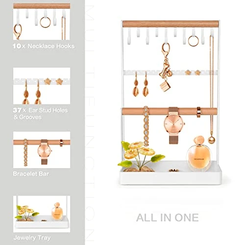 - [Practical Design]: 4 tiers in one, effectively save space and easy to access. There are 10 hooks to hang necklaces, a row of earring holder to store various earrings, a wooden bar to hold bracelets and watches, a bottom tray to place rings, brooches, lipsticks, perfumes, etc. The bottom cushions of the jewelry rack prevent scratching the tabletop or making noise.