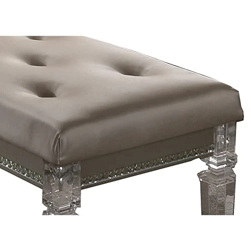 - A single piece of Bench only. Tufted leatherette seat. Faux crystal trimming around the edges. Tapered acrylic leg support. Showcases contemporary style. Design/Look : Modern & Contemporary. Material : Faux Leather, Wood. Finish : Antique. Pattern : Solid. Bench type : Standard Benches. Frame material : Acrylic, Wood. Print : Solid. Assembly : Assembly Required. Color : Beige, Clear. Made To Order. Top material : Faux Leather. Product Size: 54.0 In. L X 18.0 In. W X 19.0 In