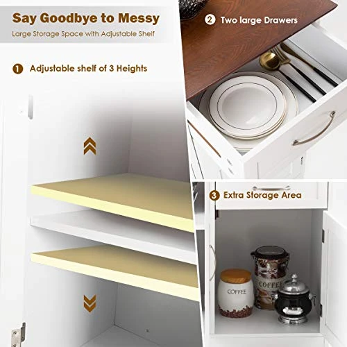 - γSpacious Top, 2-Door Cabinet & 2 Drawersγ: Spacious tabletop provides you with large space for tableware, utensils, kitchenware. 2 cabinets and 2 drawers offer you great convenience to store stuff in different sizes. Drawers are easy to glide.