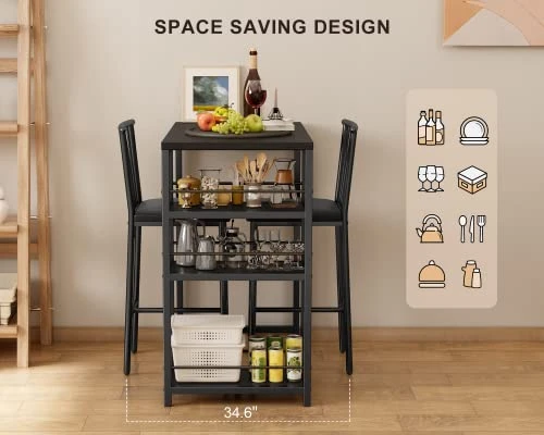 - 🏡[Ample Storage Space & Compact design] Unlike most other pub dining sets, this dinette set combines the bar counter and storage shelves, 3 deep storage shelves are perfect for placing tableware, cups, snacks, and wine, providing you with more comfort and convenience. And the chairs can be placed under the table to save space when not in use. It is an excellent solution for small spaces, such as condo, kitchen, studio or apartment.
