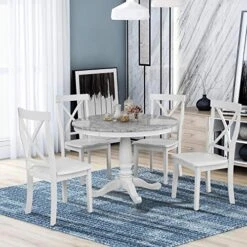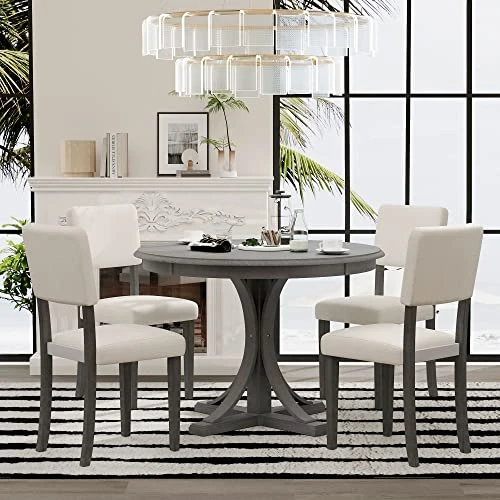 - [5-Piece Round Dining Table Set] – The 5-piece dining set is composed of one dining table and four chairs. Designed practically and compactly, it can easily fit into your space and seat up to four family members. Round table top with no sharp corners helps to protect your children and the elderly. The design takes into account the sense of use and comfort.