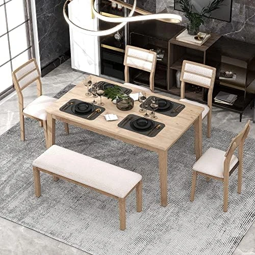 - 【Suitable for Family Use】This set of tableware includes 1 table and 6 chairs, this multi-functional 7 piece dining table set seats up to 6 people, perfect for families to enjoy meal times together. The spacious desktop has plenty of space to put the things you need, such as your dinner, fruit bowl, vases, candles and other things. This dining table with 6 chairs takes into account the sense of use and comfort, and is the best choice for your dining room.
