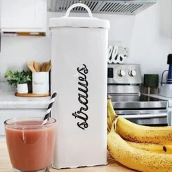 AuldHome Farmhouse Enamelware Straw Holder (White); Rustic Metal Straw Storage Canister