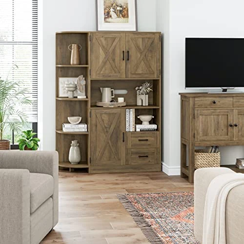 - UPGRADE YOUR KITCHEN STORAGE: Featuring ample compartments, three cupboards each with adjustable shelf, a 4-tier external shelf and 2 easy-glide drawers, this functional buffet cabinet provides both open areas and hidden spaces to keep all your kitchen appliances and cooking accessories well organized