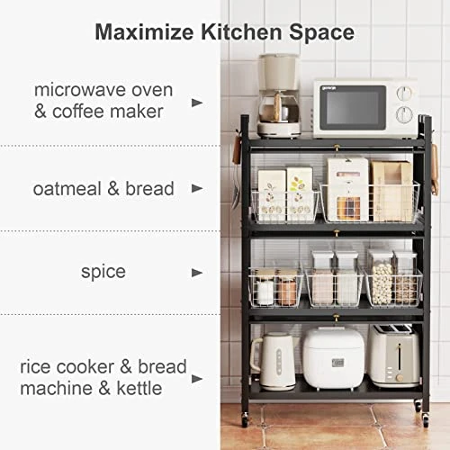 - [Maximize Kitchen Space] 4 tier black bakers rack makes full use of the vertical space. Various small kitchen appliances can be stored in partitions; free up your countertop and enjoy an orderly life