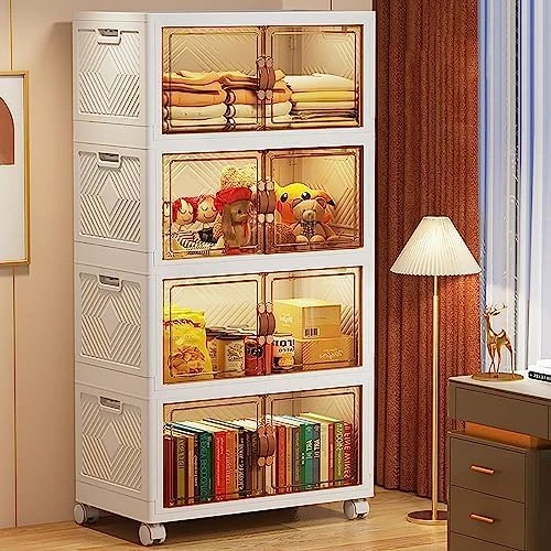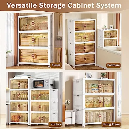 - ✅【Heavy-Duty & Large-Capacity Storage Container】: The dimensions of 4-Layer extended plastic storage bin with lid is 21.65″ L*13.78″ W*48.82″H, owns 16 gallons (64 quarts) per layer, storage capacity. Thanks to premium PP material, our kitchen storage cabinet with door has the characteristics of sturdy, odorless, durable and strong load-bearing. 🚩Remarkably, it’s a combination of 4 boxes connected together, which means package only include 1 lids + 4 boxes + 4 caster wheels.