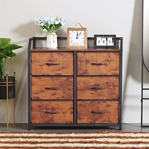 - ✅【Charming Retro Rustic Brown Wood Look】No details are overlooked—brown surface with a wood look, matte black frame and the fabric texture of the drawer. Inspired by industrial design, and injected with a rustic charm, matches well with your other home decor. This chest of drawers adds not only a vintage, simple storage solution to your home, but also an elegant and fresh feeling.