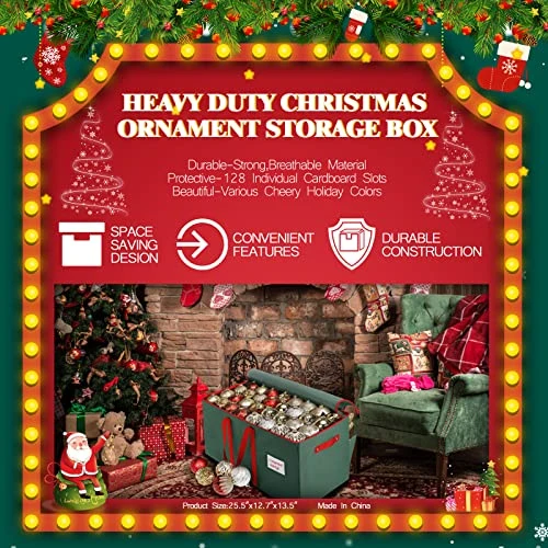 - 【Extra Large Capacity – Keep Your Ornaments Safe】Organizer is large enough to fit up to 128 Christmas ornaments, each one 3 “. side pockets for added storage space to place extra items. Picture yourself taking down your Christmas tree , you can easily put holiday ornaments in place without having to worry about the space. Dimensions: 25.5″ x 12.7″ x 13.5″.
