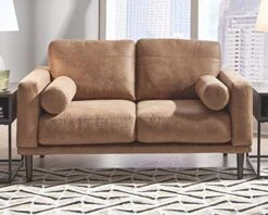 Signature Design By Ashley Arroyo Mid Century Modern Faux Leather Loveseat, Caramel Brown