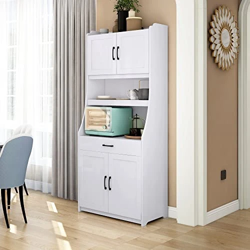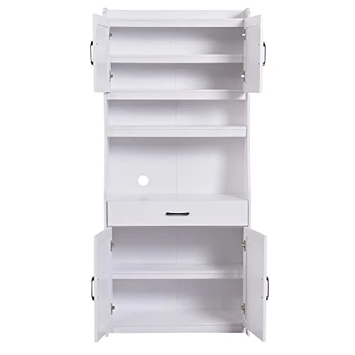 - 【Kitchen Pantry with Open Shelves】The open shelf in the middle of this buffet cabinet can hold condiments or small pots of items. The back plate of large platform above the wide drawer has an integrated hole for wires, making it easy for a microwave or oven. There is a small platform on top of the top storage cabinet for storing debris.