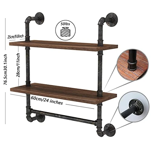 - 【Iron Pipe Shelves Size 】Wall Mount Rustic Bathroom Shelves size in W 24’’x D 9.84’’ x H30 ‘’(61x25xH76.5cm) 2 Shelves with practical inner height for your wall space. Load Capacity 50 lbs for each shelf. Meet your most requirement for a wall shelf.