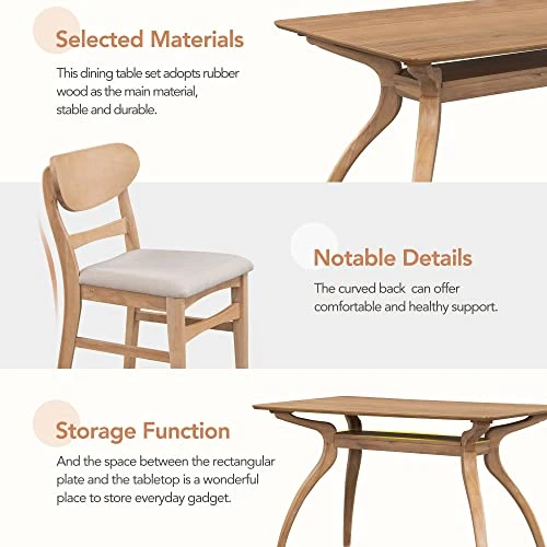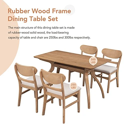 - 【High-quality materials】The tabletop is comprised of MDF board with an acacia wood veneer top that has a clean finish and a transparent texture. The table and chair legs are constructed of rubber wood, while the seat cushions on each chair are made of foam and polyester. These components guarantee the reliability and robustness of this dining table set in normal use. 250 lb weight limit for tables and 300 lb for chairs.