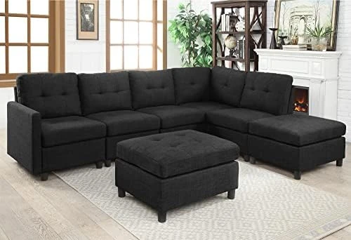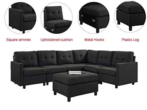 - Easy to assemble: This modular sectional sofa will ship by 7 boxes, include 1xleft arm chair,1xright arm chair, 1xcorner chair, 3 xarmless chairs and 1xottoman. You can easily assemble all the parts together to create a sofa within 20 mins based on the instructions.The overall dimention for this sofa is 95.2″W x 72.4″D x 33.9″H, the height from seat to floor: 17.8″,Seat depth:19.7″