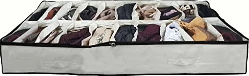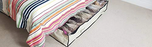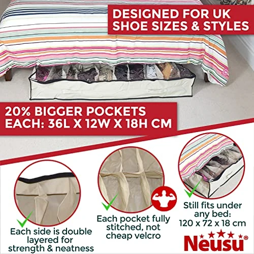 - Biggest Underbed Shoe Bag – 47.3″ x 28.4 x 7.1″ (approx) or 120cm x 72cm x 18cm – 20 pockets each capable of storing shoes up to men’s size 12 (trainers even) ” each pocket larger and taller than other brands’ bags