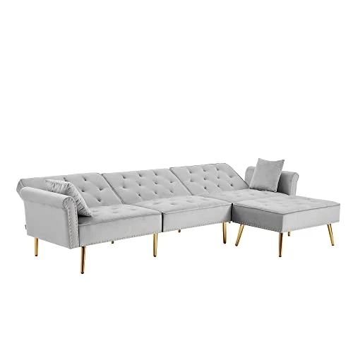 NOSGA Sectional Sleeper Sofa Couch Bed, Velvet L-Shaped Convertible Tufted Couch With Chaise Lounge, Rolled Arm Upholstered Nailhead Chesterfield Sofa With Movable Ottoman For Living Room(Grey)