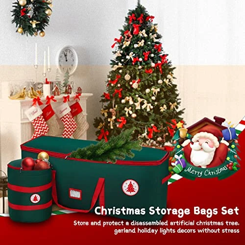- 【Large U-shaped Opening, Reinforced Handles for Easy Placement & Carry】Our XL Christmas tree waterproof storage bags 2-piece set features a large U-shaped opening and double zippers for easy placement and removal of your Xmas tree and Christmas lights ornaments, and they adopt reinforced handles to support heavyweight and easy carry to your attics, basements, closets, etc.