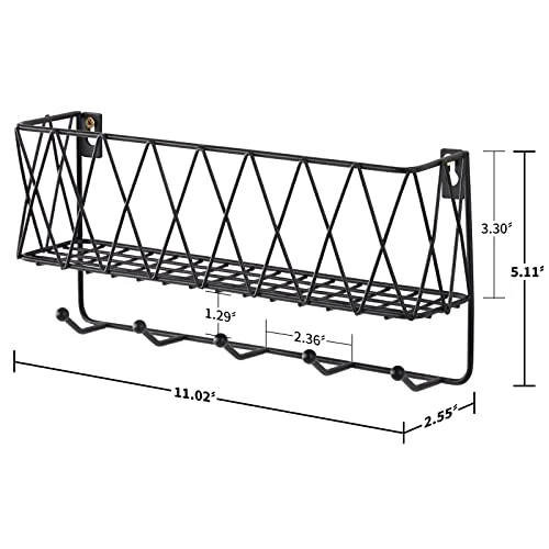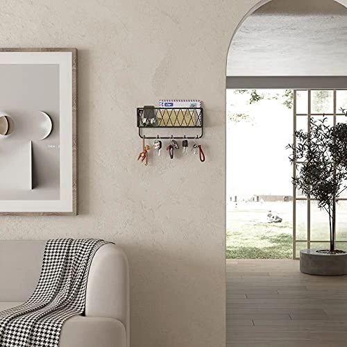 - 【Multi-purpose】 Perfect for storing variety of items such as your mail, letter, check, daily bills, magazines in the basket, and hanging keys, leashes, hats, masks, umbrellas, towels, cooking utensils and other accessories on the attached 5 hooks. Keep your entryway perfect organized without messy