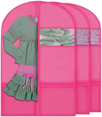 - Zippered mesh pockets hold shoes and accessories: Store any shoes or accessories alongside costumes and dresses. Each garment bag includes two zippered mesh pockets on the front, keeping your extra pieces easily accessible and visible.
